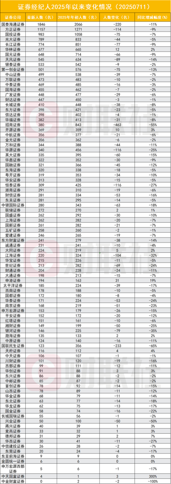 2025年以来,共有77家券商证券经纪人减少明显,均超过百名。招商证券(-463名)、国联民生证券(-233名)、国泰海通证券(-220名)、恒泰证券(-116名)、华源证券(-116名)、方正证券(-114名)、江海证券(-104名)。
